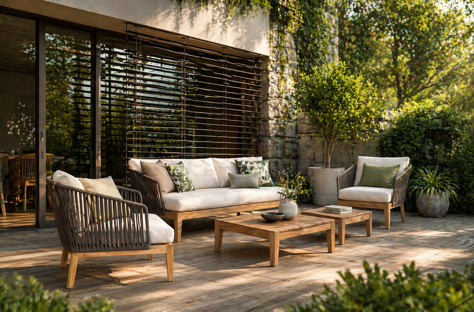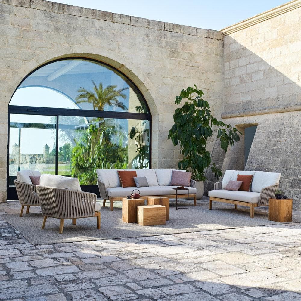 Elegant 2 seater outdoor sofa crafted from premium teak wood with olefin rope weaving and plush cushions for luxurious outdoor comfort.